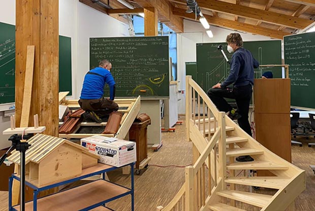 Berufsschullehrer Alexander Sedlmaier kniet auf einem Miniaturdach aus Holz und hält einen Sparrennagel in die Kamera, sein Kollege Andreas Schillinger filmt ihn – so sieht Homeschooling für die BGJ-Zimmerer/Zimmerinnen an der Berufsschule Traunstein aus. Vor kurzem stand das Thema „Sturmsicherung am Dach“ auf dem Lehrplan.